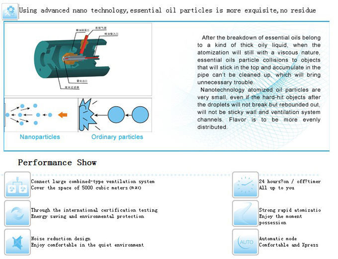 Scent diffuser machine adopts cold two-fluid atomization technology, the high-speed collision of cold air hits aroma oil into nanoscale mist, the machine sprays the mist out of the atomizer, the scent flows along through the air.