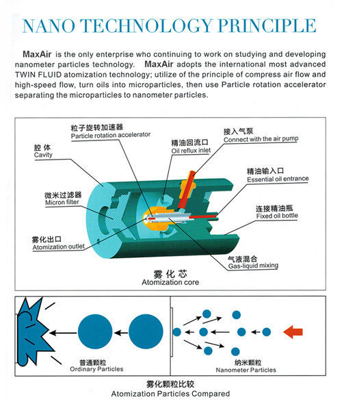 Scent diffuser machine adopts cold two-fluid atomization technology, the high-speed collision of cold air hits aroma oil into nanoscale mist, the machine sprays the mist out of the atomizer, the scent flows along through the air.