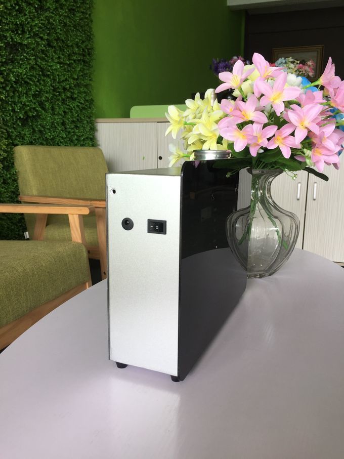 Scent diffuser machine adopts cold two-fluid atomization technology, the high-speed collision of cold air hits aroma oil into nanoscale mist, the machine sprays the mist out of the atomizer, the scent flows along through the air.