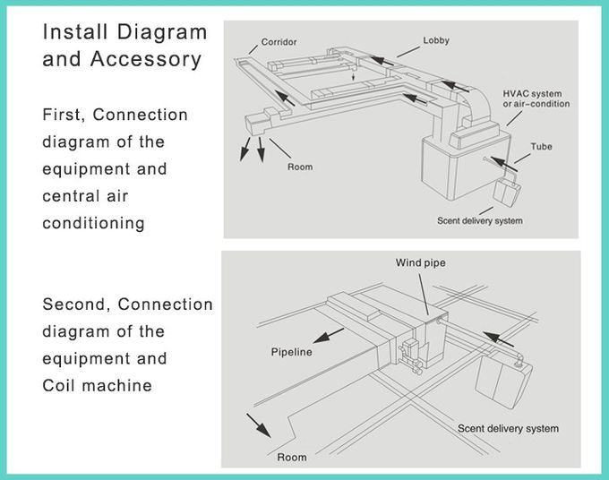 1. Scent Diffusion System includes two parts: fragrance diffuser engine and installation accessories (air conditioner connecting pipe,plastic tube and location- plate).